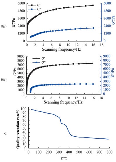 Through molecular structure design, Zhang et al. [68] used acrylamide (AAM), butyl methacrylamide and AMPS as monomers, flexible fibers as reinforcing materials, ammonium persulfate (APS) as an exciter, and reacted them with a homemade macromolecular bridging agent BWL to make a high-temperature-resistant fiber reinforced gel plugging agent. Microgel BWL is used as a cross-linking agent, which is firstly a reactive monomer, capable of its own polymerization and controlled polymerization conditions to obtain a partially polymerized microgel. Partially polymerized microgels are produced by polymer macromolecular chains with reactive termini (amide groups, carboxyl groups, acyl groups, etc.), then cross-linking them with organic carboxyl and acyl groups, etc., and finally reacting them with organic cross-linking agents. The reaction with organic cross-linking agents results in microgels containing a large number of reactive C=C double bond groups. Since BWL contains a large number of C, the crosslinking density of BWL with monomers is much higher than that of monomers with conventional organic crosslinkers, thus forming a dense three-dimensional mesh structure with good thermal stability. The stable value of the energy storage modulus of the gel is about 5500 Pa before the addition of flexible fibers. The energy storage increases significantly to about 7200 Pa after the addition of flexible fibers (Figure 2B). The blocking rate reaches 98% at 100 °C (Figure 2C). When the temperature increases to 250 °C, it still has good stability. The mass retention of IPG remained high at 350 °C, which indicates that the plugging agent has good temperature resistance. The author believes that the addition of flexible fibers can physically cross-link with the main chain and side chains of the gel, making the three-dimensional network structure of the gel more compact, which in turn increases the toughness of the gel and enhances the temperature resistance of the gel.
