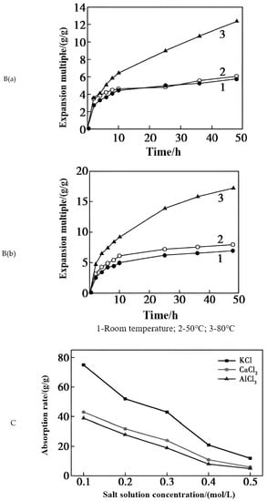 Wang et al. [78] introduced a salt-tolerant monomer AMPS through an aqueous solution. The absorbent resin gel of acrylic acid-2-acrylamido-2-methylpropanesulfonic acid copolymer [P(AA-AMP)] is developed by using tetraallyl ammonium chloride (TAAC) as a bridging agent and potassium persulfate (KPS) as an initiator. The changes in water absorption properties of water absorbent resin in different salt solutions were studied experimentally at 150 °C (Figure 3C). Its water absorption rate can reach 78 g/g in 1% NaCl. This shows that the water absorbent resin gel has excellent temperature and salt resistance. The prepared water-absorbent resin has good high temperature resistance and is stable in 100 to 200 °C. The water absorption performance is stable within 200 °C. The absorbent resin has excellent acid and alkali resistance in a salt solution, and can maintain relatively high absorption multiplicity between pH = 5~9. In different types of Cl− salt solutions, the absorbency of the absorbent resin decreases with increasing concentration of the salt solution. The higher the cationic valence at the same concentration, the lower the absorbency. The water-absorbing resin gel has achieved good results in experiments, expanding its use within the high-temperature and high-salt petroleum industry.