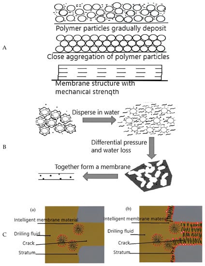 Song et al. [101] researched the film formation mechanism of styrene butadiene rubber (SBR) polymer emulsions. After the emulsion polymers evaporate through water, the polymer particles approach each other and combine to generate a blocking film (Figure 6A). A visible sand bed of 20 mm thickness was prepared by using quartz sand of 0.18–0.28 mm grain size to simulate a high permeability funnel formation. The corresponding pore throat size was 0.056 mm, and the loss of drilling fluid filtrate and the depth of filtrate intrusion were tested by means of pressure measurements. The experimental conditions were 25 °C, 0.7 MPa, and 7.5 min. The drilling fluid formulation was 3% bentonite slurry + 3% bridging filler particles + 4% ultrafine calcium carbonate + 5% SBR polymer. A 30 μm microfracture was simulated with a self-modified microfracture plugging evaluation device, and the drilling fluid was taken from the site. First, they evaluated the effect of 5% SBR polymer addition on the performance of drilling fluid. According to the 2/3 bridging theory, 3% of calcium carbonate with a particle size of 0.02 mm was added to the drilling fluid to conduct high-temperature and high-pressure filtration loss experiments. Through the above polymer emulsion sealing effect experiments, SBR polymer can form a dense mesh-like film structure in the mud cake and form irregular fibrous bridge plugs on the surface of cracks and pores. It can act synergistically with the bridging particles to improve the bridging plugging efficiency and reduce filtration loss. The application of SBR film-forming fluid can form a mesh-like reinforced layer on the well wall, improve the dense and flexible filter cake, reduce the percolation effect of drilling fluid, and be a good solution to the problem of well wall instability in deeply fractured formations, providing technical support for oilfield deep drilling and development.
