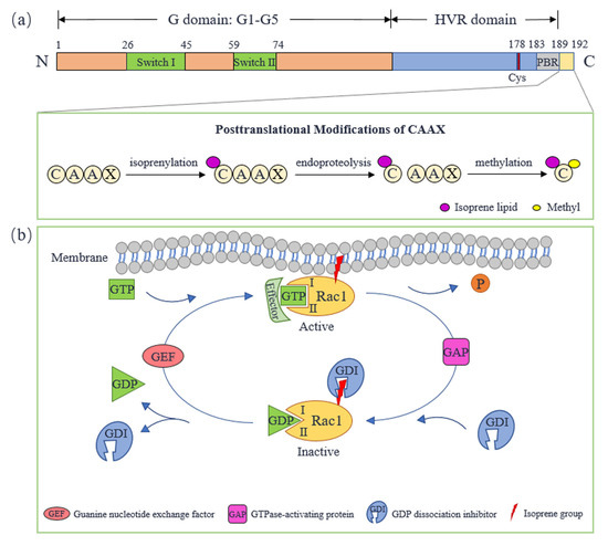 Rac1, initially identified in human platelets, is a kind of small GTP-binding protein and a member of the Rac subfamily of the Rho family in the Ras superfamily. Rac1 is named for its role as a substrate for botulinum C3 ADP ribosyltransferase [8,9]. The human Rac1 gene is located on chromosome 7p22, composed of 7 exons over a length of 29 kb [10]. The protein coded by the Rac1 gene comprises 192 amino acids, and its molecular weight is about 21 kDa. The N-terminal of Rac1 contains a conserved G-domain [11], consisting of five sequences, G1–G5 (Figure 1a), which is a basic functional unit of GTP-binding protein to bind or hydrolyze GTP [12]. Rac1 transforms between switch-ON state (GTP-bound form) and switch-OFF state (GDP-bound form). This is achieved through the conformational change in switch I and switch II, which involves amino acid residues 26 to 45 and 59 to 74, respectively [13,14]. The C-terminal of Rac1 contains a hypervariable region (HVR) [11] with a conserved cysteine residue at position 178, which is similar to Rac2 and Rac3. Downstream from the cysteine residue is a polybasic region (PBR) composed of polybasic amino acid residues. Rac1′s C-terminal sequence term is CAAX (C represents cysteine, A represents an aliphatic amino acid, and X represents any amino acid) [11,15,16], which is adjacent to PBR. CAAX is the site of Rac1 to undergo a series of posttranslational modifications. This is necessary for Rac1′s correct subcellular localization (mainly in plasma membrane), so that Rac1 can exert its biological function. The posttranslational modifications undergo three steps: (1) isoprenylation modification of cysteine residue in CAAX; (2) -AAX is cleaved from Rac1′s C-terminal which is catalyzed by endoprotease; (3) methylation modification of prenylated cysteine residue. These modifications enhance hydrophobicity to promote the localization of Rac1 on the plasma membrane [15].