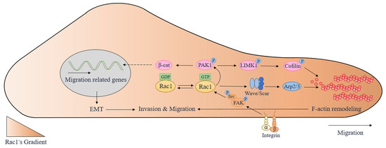 Ras-related C3 botulinum toxin substrate 1 (Rac1) is one of the central members of Rho GTPases. As a cytoskeleton regulatory protein, Rac1 regulates cell adhesion and movement mainly by promoting actin cytoskeleton remodeling, playing an important role in transferring migration signals to the cytoskeleton [6]. Rac1 widely exists in various cell types and is highly expressed in tumors. Increasingly, studies are reporting the role of Rac1 in tumor invasion or metastasis and are, therefore, suggesting that Rac1 is a potential target for tumor therapy [7]. In this review, we summarize the role of Rac1 in cell migration, tumor invasion and metastasis, and the regulatory mechanisms involved.