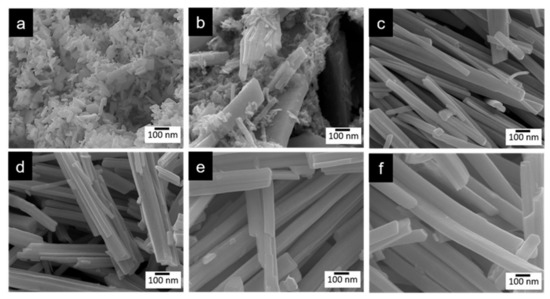 The SEM images showed different morphologies depending on the addition of N2H4. WO3-0 is composed of small irregular nanoblocks with diameters of 10−50 nm (Figure 1a). Figure 1b−f shows the images of N2-intercalated WO3 prepared using different addition of N2H4. It can be clearly found that the mixed morphologies of nanorods in large scale and small nanoblocks start to be observed from nW:nN2H4 of 1:0.62 (Figure 1b). There are not so many differences in the length and width of the nanorods which are obtained from nW:nN2H4 ratio of 1:1.25 to 1:2.5. However, the length and width increased as the nW:nN2H4 ratio increased from 1:5 to 1:7.5.