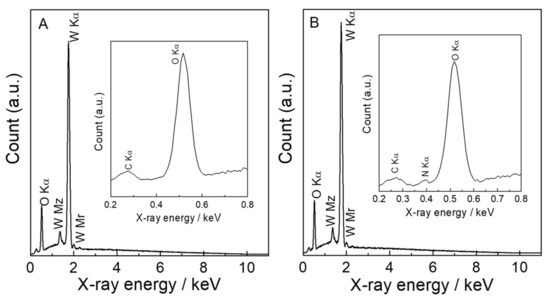 The EDS data of (A) WO3−0 and (B) WO3−2.5 in the range of 0–11 keV. (Insert) The magnified EDS data of WO3−0 and WO3−2.5 in the range of 0.2–0.8 keV, respectively.