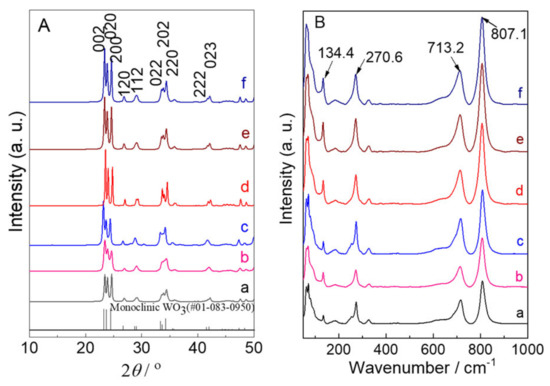 (A) XRD patterns and (B) Raman spectra of (a) WO3−0, (b) WO3−0.62, (c) WO3−1.2, (d) WO3−2.5, (e) WO3−5, and (f) WO3−7.5, respectively.