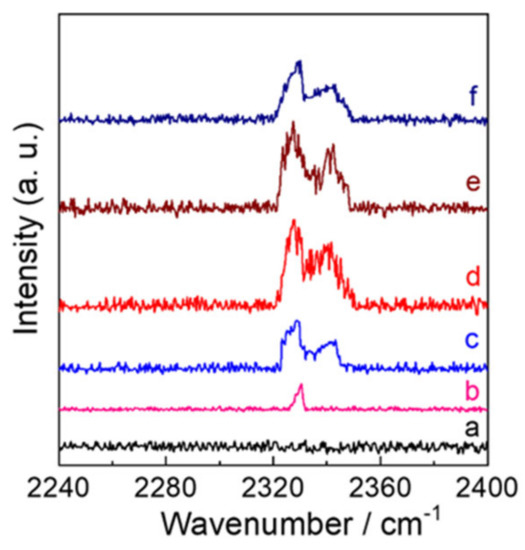 Raman spectra in the wavenumber region of 2240–2400 cm−1 for (a) WO3−0, (b) WO3−0.62, (c) WO3−1.2, (d) WO3−2.5, (e) WO3−5, and (f) WO3−7.5, respectively.