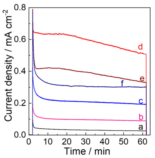 Photoelectrocatalysis was conducted under the visible light irradiation (λ > 450 nm, 100 mW cm−2) at potentiostatic conditions of 0.5 V vs. Ag/AgCl (1.05 V vs. RHE) in a 0.1 M phosphate buffer (pH 6.0) for 1 h using different electrodes (Figure 11). A higher photoanodic current due to water oxidation was observed for the WO3−2.5 electrode. The highest charge amount passed and the amount (nO2) of O2 evolved during the 1 h photoelectrocatalysis for WO3−2.5 was 2.05 C and 5.19 mmol (97% Faradaic efficiency), respectively, compared with the electrodes prepared at other conditions (Table 3). These results clearly prove that the intercalation of N2 enhances the PEC performance of WO3−2.5 in application to water oxidation. The decay of photoanodic currents was observed for all electrodes. This can be attributed to the formation of inactive tungsten-peroxo adducts [15] and adherence of O2 bubbles [56].