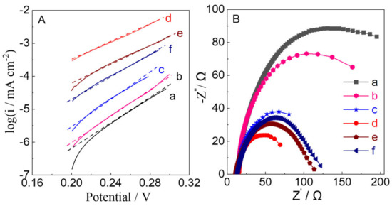 (A) Tafel plots and (B) Nyquist plots of (a) WO3−0, (b) WO3−0.62, (c) WO3−1.2, (d) WO3−2.5, (e) WO3−5, and (f) WO3−7.5 electrodes for photoelectrocatalytic water oxidation in a 0.1 M phosphate buffer solution (pH = 6).