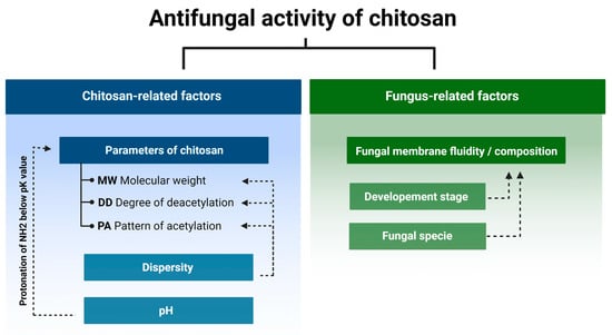Currently we know that the antifungal activity is shaped by the combination of several attributes such as the original source of chitin (crustaceans or fungal), an average DD and MW, as well as the diversity range of these parameters of a particular batch of CS (Figure 2) [24,25,26,27]. In certain cases, antifungal activity of CS might even exceed that of a commercial fungicide [28]. Diverse species of fungi respond differently to CS applications, and the sensitivity varies depending on their life cycle phase [29,30]. Several mechanisms have been proposed to explain the antifungal activity of CS. They include local disintegration of fungal cell membranes, leakage of cytoplasm, chelation of crucial nutrients, and binding of nucleic acids altering the flow of genetic information [4,31]. As stated above, the process of CS production determines the unique physicochemical properties of the CS batch, which have a huge impact on antifungal activity. The effect of pathogenic fungi by CS, although studied by a number of research groups, is not based on clear guidelines to standardize the experiments. Because of this, the biological material, experimental conditions, and characteristics of the CS samples varied significantly [13,32,33].