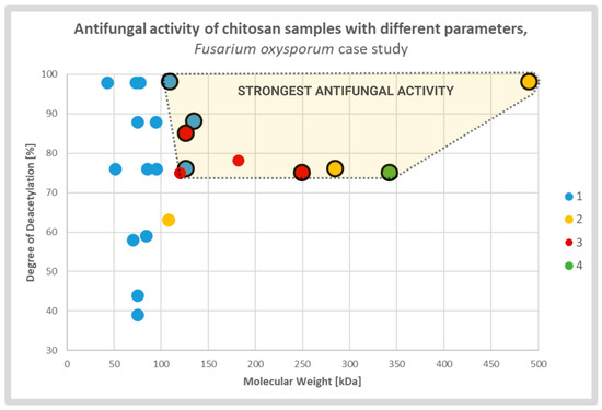 Scatterplot graph of antifungal activities of chitosan samples with different parameters tested on Fusarium oxysporum. Chitosan samples showing the strongest antifungal activities are encircled and highlighted. The colors and respective numbers indicate the cited articles: 1 [13] 2 [27] 3 [54] 4 [55].