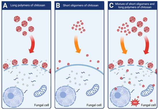 Schematic mechanisms of antifungal activity of different weight fractions of chitosan. (A) High molecular weight chitosan destabilizes fungal cell membranes leading to the leakage of intracellular components. (B) Low molecular weight chitosan fractions do not destabilize fungal membranes and show very weak antifungal effect. (C) Chitosan mixture of high and low molecular weight fractions shows strong antifungal activity. High molecular weight fractions destabilize the membranes allowing the low molecular fractions to penetrate fungal cell and to disturb cell processes.