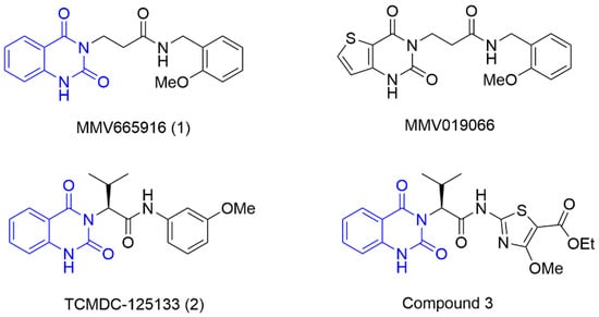 Structures of MMV665916, MMV019066, TCMDC-125133, and compound 3 with their quinazolinedione moiety highlighted in blue.