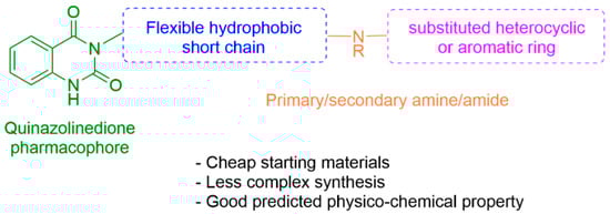 To identify potential analogues of quinazolinedione 2 which could be progressed further in a drug discovery pipeline, a preliminary in silico prediction is required. SwissADME, a web-based in silico calculation, is a powerful tool to provide some physicochemical, pharmacokinetic, and ADME (absorption, distribution, metabolism, and excretion) parameters necessary in the small-molecule drug discovery pipeline []. SwissADME was used in this work to investigate whether any other hydrophobic short chains would be suitable as a replacement for valine in compound 2. The valine side chain is a rather bulky hydrophobic moiety and contains an undesirable stereocenter; these factors could hamper further drug development.