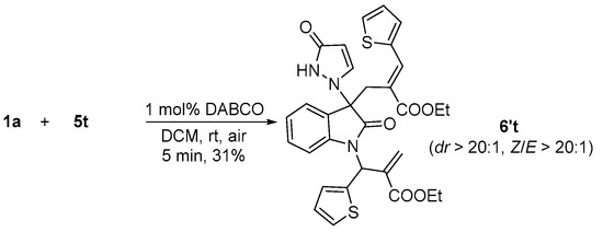 Subsequently, the generality of the allylation was further demonstrated using various aryl MBH carbonates. As outlined in Table 3, it is regrettable that all the yields of examples were not better than that of the model reaction, regardless of electron-donating groups and electron-withdrawing groups in phenyl. All the results showed that these reactions gave a complex when the aryl groups of MBH carbonates were 4-MeOC6H4, 4-FC6H4, 2-BrC6H4, and 2-NO2C6H4 (entries 7, 10, 14, and 17). These reactions led to the desired products in low yields or with an inseparable by-product (see Supporting Information) when aryl groups were 2-MeC6H4, 2-MeOC6H4, 2-FC6H4, and 2-ClC6H4 (entries 2, 5, 8, and 11). To our surprise, 3-thiophenyl MBH carbonate also afforded the diallylated product 6′t (Scheme 3), similarly to that of isatin N,N′-cyclic azomethine imine bearing a 5-NO2 group in benzene ring (Scheme 3).
