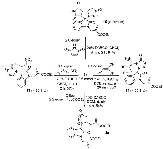 The N-allylated product 3a exhibited a potentially wide application in organic synthesis (Scheme 5). For example, the Michael addition of 3a with β-nitrostyrene in the presence of DABCO provided 3,3-disubstituted oxindole 13 in 37% yield with >20:1 dr, while no product was obtained in the condition reported by Wang’s group [22]. The [3+3] cycloaddition of 3a with Knoevenagel adduct under K2CO3/DCE could afford spiropyridazine oxoindole 14 in 60% yield with >20:1 dr, which the [3+2] cycloaddition of 3a with maleimide also produced tricyclic spiropyrrolidine oxoindole 15 in 91% yield with >20:1 dr. Finally, 3a could be converted into diallylated product 4a with moderate yield (64%).