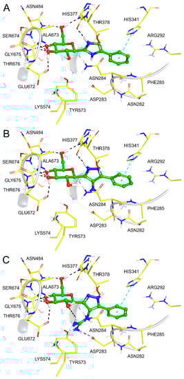 Analysis of 3. Results of the DFT calculations for predicted conformations of compound 3 are shown in Table 2. The unbound state calculations for 3 revealed, as expected, that the -NH2 azole ring substituent would not be protonated using Jaguar pKa (predicted pKa for the protonated -NH3+ state was 4.69), as was also predicted by LigPrep [36]. There are two neutral tautomeric states t1 and t2 for compound 3 (Figure 1) and the calculated key dihedral angle ω (C1H-C1-C2-N3) for the lowest energy solution phase unbound conformation of each was ω = 72.3° and −107.2° (Table 2), respectively, from the DFT calculations. The same conformations were also the most stable in the gas phase. The most stable solution phase tautomer was predicted as t1 (ω = 72.3°), but just by 0.1 kcal/mol. These most stable solution phase tautomeric conformations are shown in Figure 2A, where we can also see that intra-molecular hydrogen bonds stabilize the conformations and also, that the geometry around the -N(7)H2 substituent is not co-planar with its heterocycle. In line with expectations, the t1 tautomer is the preferred binding tautomer from MM-GBSA calculations (Table 3), with a ∆Gbind value of −40.9 kcal/mol (compared to −23.4 kcal/mol for t2). The ∆Gbind value is, therefore, significantly less favourable than that of benchmark ligand 1 (−53.1 kcal/mol), which binds in the protonated state [19]. The predicted binding modes of both compounds 1 and 3 are shown in Figure 3, (A) and (B), respectively. Compound 1 (ω = −163.7°) exploits favourable hydrogen-bonding with His377 backbone C=O and ion–ion interactions with the Asp283 sidechain carboxylate; the bound state is consistent with its solved crystallographic complex (PDB code: 5JTT),with a ligand RMSD for heavy atoms of 0.152 Å. Compound 3 also adopts a conformation (ω = −173.0°) to have an N(3)H to His377 backbone C=O hydrogen bond. However, for 3, there are no ion–ion interactions with Asp283 and the -N(7)H2 substituent cannot form direct hydrogen bonds with the carboxylate side-chain, although water-bridging interactions may be possible. Analysing the breakdown of contributions to ∆Gbind (Table 3), it is these less favourable contacts as well as potential contributions from competing tautomeric states (the unbound state tautomeric energy differences are predicted as low, as mentioned just above) that is the likely source of the much lower potency of 3 compared to 1; the value is less favourable by 14.3 kcal/mol, while the strain energy and entropy contributions are more similar.