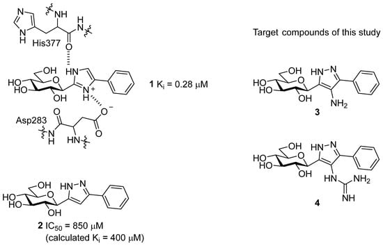 Considering the binding features of 1, it was speculated whether modifications of hydrogen bonding potential of an azole substituent with the Asp283 sidechain and/or its 3D arrangement in forming ion–ion interactions with the carboxylate sidechain group might be favourable, while maintaining the critical hydrogen bond interaction with His377 backbone C=O. In that regard, 3 and 4—the C-4 substituted derivatives of pyrazole 2 (Scheme 1)—were considered for synthesis in this study. The pyrazole linker of 3 has a potential for both His377 C=O (as shown earlier [21]) and Asp283 side-chain hydrogen bonding, while 4 has the same hydrogen bonding potential but an additional possibility for ion–ion interactions with the Asp283 side-chain. In theory, the T state conformation of the enzyme would be favoured by stabilisation of the closed conformation of the 280s loop, blocking access of the substrate to the catalytic site. In this paper, we describe syntheses of compounds 3 and 4, as well as their inhibitory potencies against rabbit muscle GPb (rmGPb). Additionally, extensive computations on the bound and unbound states of the ligands (Monte Carlo conformational searches, DFT, docking and post-docking molecular mechanics—generalized Born surface area (MM-GBSA)) are presented, to rationalize the observed binding assay results.