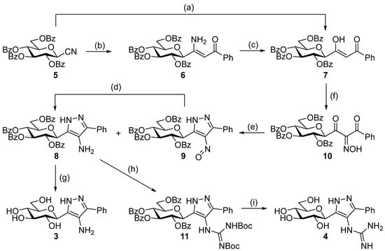 Synthesis of the target C-glucopyranosyl pyrazoles. Reagents and conditions: (a) Zn powder, Me3SiCl, phenacyl bromide, anh. THF, Ar, reflux, 2. 10% w/w aqueous HCl, 85 °C, 33%; (b) 1. Zn powder, Me3SiCl, phenacyl bromide, anh. THF, Ar, reflux, 2. 10% w/w aqueous HCl, 0 °C, 37%; (c) 10% w/w aqueous HCl, 85 °C, 27%; (d) H2, Pd(C), EtOAc, r.t., 74%; (e) N2H4·H2O, EtOH, 0 °C—r.t. 8: 47%, 9: 18%; (f) NaNO2, AcOH, H2O, 10 °C—r.t., 82%; (g) NaOMe, anh. MeOH, CHCl3, r.t., 58%; (h) N,N′-di-Boc-1H-pyrazole-1-carboxamidine, pyridine, r.t., 39%; (i) 1. CF3COOH, anisole, anh. DCM, r.t., 2. NaOMe, MeOH, r.t., 83%.