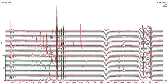Chromatographic separation was achieved using an Accucore BEHC18 column (1.7 μm, 2.1 mm × 100.0 mm; Waters Corporation, Milford, MA, USA). The column temperature and flow rate were set at 30 °C and 0.3 mL·min−1, respectively. The column temperature was 30 °C and the flow rate was 0.3 mL·min−1. The injection volume of the column was 2 μL and the detection wavelength was 200~600 nm, respectively. The mobile phase consisted of 0.1% formic acid (A) and acetonitrile (B) with a gradient elution program of 95% A (0–1 min), 95–90% A (1–3 min), 90–80% A (3–6 min), 80–30% A (6–16 min) and 30–0% A (16–20 min).