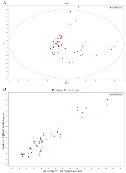 The spectral-effect relationships between the chemical composition and anti-cancer activity of T. hemsleyanum on HuH-7 cells. PCA scores of metabolites of T. hemsleyanum extracts with respect to the anti-cancer IC50 of HuH-7 (A); PLS modeling of metabolites of T. hemsleyanum extracts with respect to the anti-cancer IC50 of HuH-7 (B).