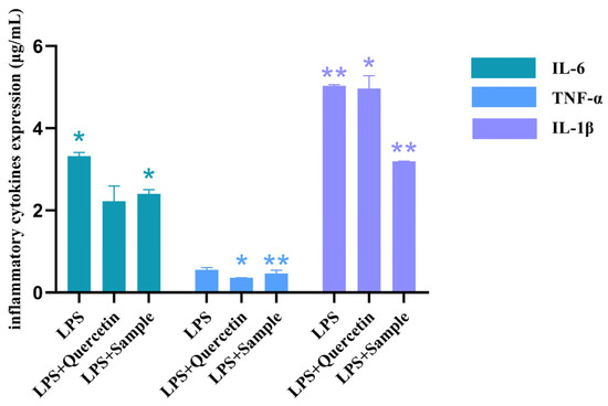 In this experiment, compound quercetin was selected as a positive control. Additionally, the expression levels of all three inflammatory cytokines were significantly decreased by quercetin (200 μg/mL) and methanolic extract samples of T. hemsleyanum (200 μg/mL). This indicated that T. hemsleyanum samples had an improved effect on the LPS-induced RAW264.7 inflammation model (Figure 6). Compared with inflammatory cytokines IL-6 and TNF-α, the expression of LPS-induced inflammatory cytokine IL-1β in RAW264.7 cells decreased by 1.10 and 0.98 after treatment with quercetin and T. hemsleyanum, respectively. Therefore, we chose interleukin IL-1β for the validation of subsequent experiments.
