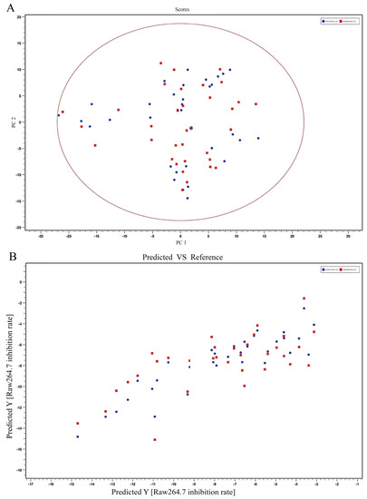 The spectral-effect relationships between the chemical composition and anti-inflammatory activity of T. hemsleyanum extracts from different origins on IL-1β expression in the LPS-induced RAW264.7 inflammation model. PCA scores of metabolites of T. hemsleyanum extracts with respect to the IL-1β expression (A); PLS modeling of metabolites of T. hemsleyanum extracts with respect to the IL-1β expression (B).