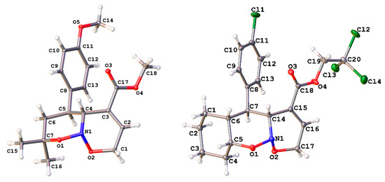 Structures of the obtained products were supported by their NMR (1D and 2D) and HRMS data. Gratifyingly, in all examined cases, the annulation was found to be stereoselective producing only one diastereomer of products 3. The relative configuration of stereocenters was also deduced on the basis of the coupling constant between C(4a)–H and C(5)–H. Its high value of 9–11 Hz evidenced about (pseudo)axial positions of both protons. This conclusion was supported by the X-ray analysis for products 3b and 3p (Figure 1). Notably, the cis-junction of two oxazine rings was observed, which can be favored by anomeric interaction within O–N–O moiety [60]. However, we should mention the conformational lability of products 3, as many signals in their NMR spectra were broadened. Especially notable was product 3p possessing three contiguous annulated six-membered rings. In its case, a lot of the 13C signals were of low intensity and were assigned only with the aim of 1H-13C HSQC spectra (see Supplementary Materials). Mentioned effects can be attributed to both inversion of six-membered rings and to nitrogen inversion [41,61].