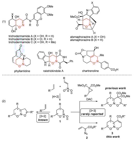 Representative bioactive 1,2-oxazine derivatives (1) and synthesis of 1,2-oxazine derivatives via cycloaddition of cyclic nitronates 1 (2). *—chiral center.