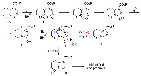 Aiming at the subsequent functionalization of product 3b, we attempted a Michael addition of dimethyl malonate across the C=C double bond. However, none of the desired transformation was observed, albeit ring contraction occurred providing pyrrolo[1,2-b]oxazine derivative 4b. This process has some precedents in the literature [67,68,69,70,71,72,73,74,75], with the closest analogue observed by Kerr et al. for non-annulated oxazines under the treatment with DBU in MeCN [67]. The proposed mechanism starts with the deprotonation at C(2), which is facilitated by the conjugation of the formed anion with C=C–CO2 moiety in D (Scheme 4). Subsequent cleavage of the N–O bond, formation of an aldehyde group, and recyclization produce hydroxypyrroline E, upon which dehydration furnishes the target pyrrole ring (path a). Some optimization of reaction conditions was performed (Scheme 5) and a combination of base (DBU) and protic additive (alcohol) was found optimal, instead of the use of a base alone (cf. yields for DBU and DBU/TCEOH). We attribute it to two main reasons. First, N–O bonds in nitroso acetals are also susceptible to basic cleavage (e.g., Scheme 4, path b) [76,77], which can lead to the formation of side products. The use of alcohol promotes the elimination of the hydroxyl group from intermediate E via hydrogen bonding, thus facilitating pyrrole formation (path a). Secondly, the presence of alcohol diminishes the amount of carboxylic acid 5, which originates from the hydrolysis of product 4a by water. Particularly, relatively large amounts of product 5 were observed when a strong base, namely, sodium tert-butylate was used. Similarly, in the excess of methanol, transesterification was observed (Scheme 6).