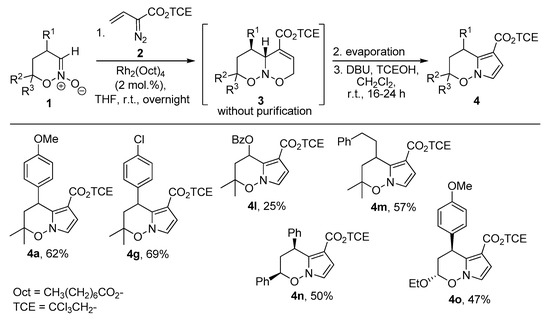 The literature provides limited data on the preparation of pyrrolo[1,2-b]oxazine derivatives [78,79], especially possessing an unsaturated pyrrole core [80,81]. Therefore, we elucidated the scope of the found transformation. Since the reagents used for the [3+3]-annulation should not interfere with the ring contraction, we decided to make a one-pot protocol for the synthesis of pyrrolooxazines 4 from oxazine N-oxides 1 and vinyl diazoacetates 2. For this purpose, the reaction mixture was evaporated after the annulation step and redissolved in CH2Cl2, followed by the addition of other reagents. This worked well providing target products 4 in reasonable yields for the whole two-step sequence (Scheme 7).