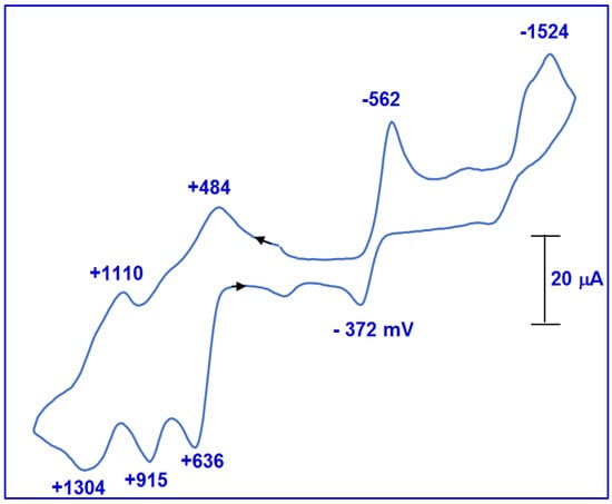 Three oxidation processes were observed in the anodic region at E½ = ca. +560, +915, and +1207 mV, which could be tentatively assigned to the three stepwise one-electron oxidations designated in Equation (2).