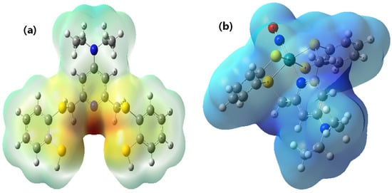 Molecular electrostatic potential (MEP) is a very suitable tool for highlighting reactive sites towards electrophilic and nucleophilic attack and also determines the relative polarity of molecules. The MEPs of TSPH2, and [RuNOTSP]+ are presented in Figure 4. The red and yellow sites (negative regions) of MEP are related to electrophilic reactivity, while the blue and green sites (positive regions) are related to nucleophilic reactivity. Figure 4 reveals that the negative MEP regions of TSPH2 are concentrated on the pyridine nitrogen atom and sulfur atoms, thus confirming their electron donor ability.