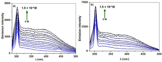 The most accurate and sensitive method for characterizing how drugs interact with CT-DNA is fluorescence emission spectra [,]. Both [RuNOTSP]+ and TSPH2 exhibit a noticeable increase in emission when CT-DNA is added because they are both luminescent in the absence of DNA. Figure 5 demonstrates that increasing the concentration of DNA at 25 °C and pH = 7.2 resulted in a regular increase in the fluorescence intensity of both compounds without shifting the fluorescence emission maximum. With increasing DNA concentration, [RuNOTSP]+ and TSPH2 solution’s maximum fluorescence intensity increases steadily at 303 nm, with no discernible change in the position or shape of the emission bands. The increase in emission intensity is most likely caused by the modification of the compound’s environment and the degree to which the compound has been inserted into the hydrophobic environment inside the DNA helix. Fewer solvent molecules can reach the binding site due to the hydrophobic environment inside the DNA helix, preventing the quenching effect. The DNA helix effectively protected both compounds, as evidenced by the fact that relaxation vibrations decreased and emission intensity increased. The increase in emission intensities reveals their binding to DNA into its hydrophobic pocket along the major and minor grooves [,]. These fluorescence improvements demonstrate that [RuNOTSP]+ and TSPH2 both interacted with DNA to increase the quantum efficiency of the complex. Similar to the quenching process, Equation (3) can be used to determine the enhancement constant [,]: