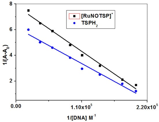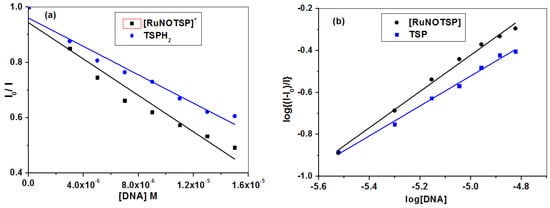 where I0 and I are the fluorescence intensity of the fluorophore in the absence and presence of different concentrations of DNA, respectively. The linear equations of log (I – I0)/I vs. log [DNA] are shown in Figure 6b. The Kf values demonstrate the complex’s remarkably high affinity for DNA, and the n values from the slope of the straight line are 0.9 and 0.7 for ctDNA-[RuNOTSP]+ and ctDNA-TSPH2 adducts, respectively.