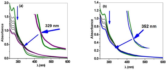 Figure 8 shows the absorption spectra of [RuNOTSP]+ and TSPH2 in the absence and presence of increasing amounts of CT-DNA. The UV–vis absorption of [RuNOTSP]+ and TSPH2 is significantly perturbed by the addition of increasing amounts of CT-DNA. In detail, the UV absorption bands of [RuNOTSP]+ (272 nm) and TSPH2 (276 nm) show a red shift of about 3 nm and hypochromism (Figure 8). For [RuNOTSP]+, a clear isosbestic point was observed at 329 nm, whereas for TSPH2, the isobestic point comes at 352 nm (Figure 8). Similar spectral properties, such as bathochromic shift and hypochromism in the presence of CT-DNA, have been observed for ruthenium (II) complexes and have been linked to a mode of binding involving an interaction of aromatic chromophores with the base pairs of ctDNA that stacks []. Using Equation (6) [] and Figure 9, it was discovered that [RuNOTSP]+ and TSPH2 have intrinsic binding constants, Kb, of (2.4 ± 0.2) × 105 M−1 and (1.9 ± 0.3) × 105 M−1, respectively. These values are higher than those reported by Barton and colleagues [] for related ruthenium complexes (1.15 × 104 M−1). Furthermore, the Kb values are very close to the binding constants of the delta and lambda isomers of [Ru(o-phen)3]2+, which were assigned as non-intercalators []. This result indicated that [RuNOTSP]+ binds to DNA stronger than TSPH2.