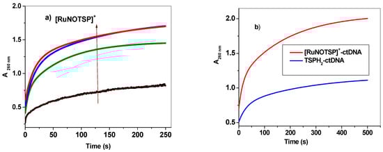 (a) Absorption intensity of the formation of ctDNA–[RuNOTSP]+ complex as a function of time after mixing of ctDNA with a different concentrations of [RuNOTSP]+; (b) absorption intensity of the formation of ctDNA–TSPH2 and ctDNA–[RuNOTSP]+ complexes as a function of time after mixing for long time.