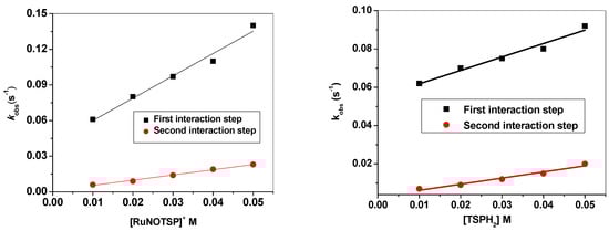 Figure 11 depicts plotting of kobs1 vs. the concentration of [RuNOTSP]+ and TSPH2 and for the first step gave a linear relationship with a slope kon [M−1 s−1] and an intercept koff [s−1], and the observed rate constant can be expressed by Equation (8).