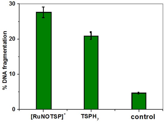 Apoptosis is a distinct morphological and biochemical process that results in cell death and is induced by a number of physiological and pathological factors. Chemotherapeutic agents cause apoptosis, which partially kills cells. The quantification of this process allows for the study of various cellular responses to chemotherapy and possibly clinical sensitivity. The apoptotic process causes cell shrinkage, membrane blabbing, nuclear condensation, and inter-nucleosome DNA fragmentation. There are numerous ways to identify apoptosis along this pathway. The ctDNA cleavage abilities of [RuNOTSP]+ and TSPH2 were measured using a diphenylamine assay. Generally, single-strand or double-strand breaks can convert the plasmid DNA from supercoil DNA to other forms of DNA [,]. The diphenylamine assay results are shown in Figure 12. For control experiments, untreated DNA showed a little cleavage upon irradiation (~4%). However, the presence of [RuNOTSP]+ or TSPH2 could cleavage DNA effectively. Compared to TSPH2, cationic [RuNOTSP]+ displayed higher cleavage efficiency against plasmid DNA due to its stronger DNA binding affinity, revealing the synergistic effect of TSPH2 in the form of the complex.