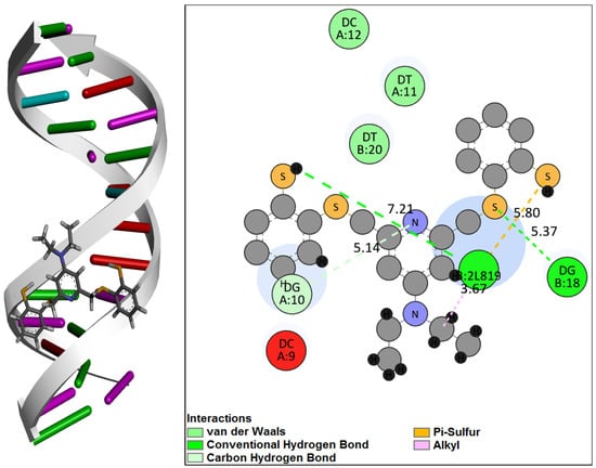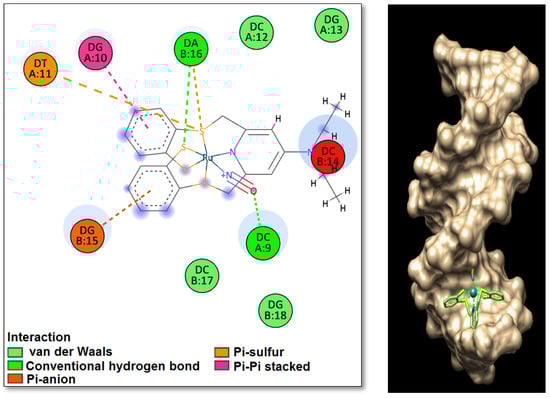 The molecular docking technique introduces a small molecule into the binding site of the DNA target-specific region primarily in a non-covalent mode, which can aid in rational drug design and mechanistic studies. Interaction mode and binding affinity docking studies on TSPH2 and [RuNOTSP]+ with B-DNA have been carried out to investigate the most likely binding site [] (PDB ID: 1BNA). For molecular docking, we used the new server PatchDock [], and the best docking model is shown in Figure 13 and Figure 14. As the DNA fragment (2L8i) contains a triazole template, which has a far better affinity and specificity than unmodified oligonucleotides, and it is also highly resistant to nuclease destruction []. Both compounds [RuNOTSP]+ and TSPH2 are docked to the major groove of the DNA fragment (2L8i), as seen in (Figure 13 and Figure 14), where [RuNOTSP]+ binds to DNA through different types of interactions as one sulfur atom forms one hydrogen bond (HB) with strand B (SB), adenine Base Strand (A) (SA) Number 16; also one HB between oxygen and Cytosine (C) base SA No. 9; van der Waals interaction between [RuNOTSP]+ and different bases such as C No. 12 SA, Guanine (G) No. 13 SA, C No. 17 SB, G No. 18 SB; π-π stacking interaction between phenyl group and G No. 10 SA; π-sulfur stacking interaction with sulfur atom and Thymine (T) No. 11 SA; pi-anion interaction with G No. 15 SB and steric effect at nitrogen and C No. 14 SB. These different types of interaction for [RuNOTSP]+ are stronger and more stable than TSPH2, as shown in (Figure 13 and Figure 14). TSPH2 binds to DNA by several types of interactions as two sulfur atoms forms: 2 HB with SB G Number 18; HB between sulfur and triazole linker No. 19 []; van der Waals interaction between TSPH2 and different bases such as C No. 12 SA, T No. 11 SA, and T No. 20 SB; HB with nitrogen and G No. 10 SA; π-sulfur stacking interaction with sulfur atom and carbon of the TSPH2 and steric effect at nitrogen and C No. 9 SA. The hydrogen bond acceptor sites of the DNA phosphate group in combination with DNA polymerase can thus be mimicked using the triazole template strand [] or TSPH2, and this will have an effect on DNA bending, rigidity, and recognition. In a previous study [], the docking results showed that BSA-[RuNOTSP]+ with binding affinity (−7.27 kcal/mol) and BSA-TSPH2 with binding affinity (−8.05 kcal/mol) are located in subdomain IA and it has recently been reported as a possible binding site for drugs on BSA [].