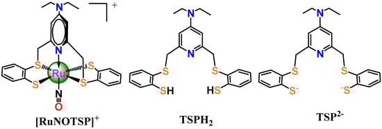 Structure of [RuNOTSP]+, TSPH2, and its anion TSP2−, respectively.