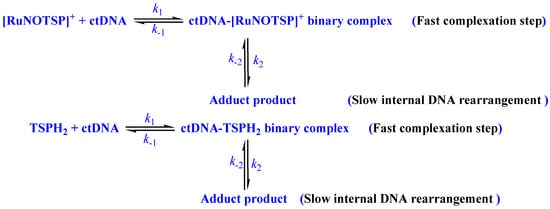 where At is the absorbance intensity at time t. Data analysis was performed using Origin 8.0 software. The number of exponentials was increased until there was no discernible systematic deviation of the residual. Figure 10 shows experimental plots of the absorption intensity of CTDNA-[RuNOTSP]+ and ctDNA-TSPH2 at 260 nm as a function of time at 25 °C for each of the two compounds. Table 4 shows the observed rate constants kobs as a function of [RuNOTSP]+ and TSPH2 concentrations at constant DNA concentration and temperature. The average of three separate experiments serves as the rate constant. The values of these rates were at least an order of magnitude apart for all of the [RuNOTSP]+ and TSPH2 under study. ctDNA-[RuNOTSP]+ and ctDNA-TSPH2 complexes were formed via a bimolecular mechanistic pathway. From the exponential plots that followed the order k1 ˃˃ k2, we were able to determine two relative rate constants (k1 and k2) for the binding process. All kinetic curves were able to fit into the bi-exponential function (Equation (7)), indicating the formation of complexes involved in a two-step process. The initial step is the fast step (rate constant kobs1), in which [RuNOTSP]+ and TSPH2 bind to ctDNA in a reversible reaction to form the binary intermediate via electrostatic interactions. The initial reaction step is thought to be the complexation and production of binary complexes. The second step (rate constant kobs2) of [RuNOTSP]+ and TSPH2 is slower than the first, involving compaction of the ctDNA and simultaneous internal rearrangement of the CTDNA-[RuNOTSP]+ and CTDNA-TSPH2 complexes [,,].