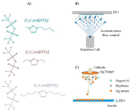 Molecular structure of the studied ionic liquids (A): 1-butyl-3-methylimidazolium bis(trifluoromethanesulfonyl)-imide [C4C1im][NTf2]; 1,3-diethyl-imidazolium bis(trifluoromethanesulfonyl)-imide [C2C2im][NTf2]; 1,3-dipenthyl-imidazolium bis(trifluoromethanesulfonyl)-imide [C5C5im][NTf2]. Schematic representation of the PVD/Knudsen effusion process of ionic liquids (B). Schematic representation (out of scale) of the sputter deposition of Ag onto ionic liquid films (C).
