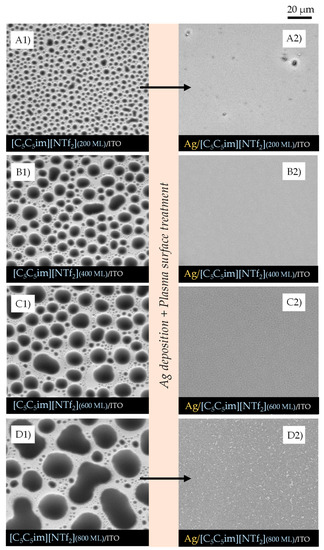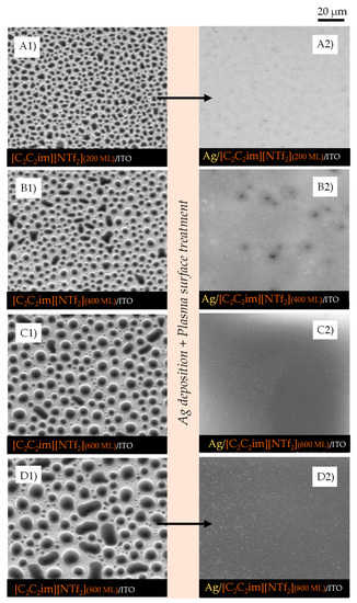 Morphology of micro- and nanodroplets for [C2C2im][NTf2] films with different thicknesses (200, 400, 600, 800 ML) deposited by PVD on ITO/glass surfaces (A1–D1). Morphology of the same samples after exposure to argon plasma and the deposition of AgNPs through sputtering for 40 s using a discharge current of 20 mA (A2–D2). Micrographs were acquired through high-resolution SEM by using an SE detector. Top views obtained with a magnification of 2000×.