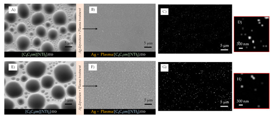 Detailed morphology of as-deposited micro- and nanodroplets (A,E) and their morphology after surface treatment with argon plasma and deposition of Ag (images (B,F)). The images correspond to the surface of [C4C1im][NTf2] (A,B) and [C5C5im][NTf2] (E,F) with a thickness of 600 ML. Images (C,D,G,H) show the presence of AgNPs in the IL films. These images were obtained by processing SEM micrographs using ImageJ software. The micrographs were acquired through high-resolution SEM using both SE (A,E) and BSE detectors (B,F).