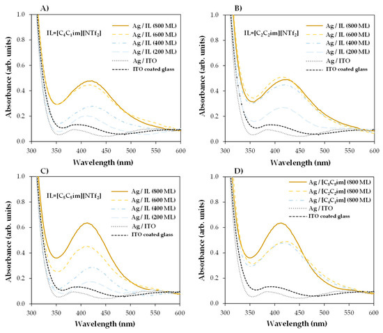 UV-Vis absorption spectra of IL films treated with argon plasma and Ag particles. Spectra for 200, 400, 600, and 800 ML of [C4C1im][NTf2] (A), [C2C2im][NTf2] (B), and [C5C5im][NTf2] (C). Comparison of the graphs obtained for each IL for a thickness of 800 ML (D). Spectra for ITO/glass and Ag/ITO/glass are presented for comparison. AgNPs incorporated into the IL films through 40 s of sputter deposition from a silver magnetron target and argon plasma (inducing the droplet coalescence) using a discharge current of 20 mA (≈13 nm of Ag); micro- and nanodroplets ILs previously prepared by vacuum thermal evaporation onto ITO-coated glass substrates. A single absorption peak with 400–420 nm might be assigned to the SPR band that is attributed to the presence of AgNPs in their metallic form.