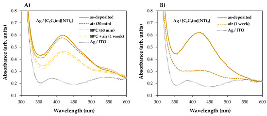 Despite a decrease in its intensity, the SPR band did not disappear, which indicates that the AgNPs were still present in the IL films even after the annealing process. For the congener AgNPs/[C2C2im][NTf2] samples (Figure 7B), the exposure to air for one week resulted in the disappearance of the SPR band. The stability and presence of Ag nanoparticles in this IL medium were found to be time dependent.