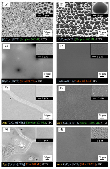 Morphology of as-deposited micro- and nanodroplets of [C5C5im][NTf2] (A,B) and morphology of coalesced IL films (C,D). Morphology of the same samples after the deposition of Ag through sputtering for 40 s using a discharge current of 20 mA (E–H). Micro- and nanodroplets of IL obtained by PVD on ITO/glass surfaces (A,B) with 200 and 800 ML of thickness. Coalesced IL films were obtained after surface treatment of the IL droplets with argon plasma (no metal target was employed) (C,E). Samples (A,B) were exposed to argon plasma and the deposition of AgNPs and the consequent morphologies are presented in (E,F). Samples (C,D) were exposed to argon plasma and the deposition of AgNPs and the consequent morphologies are presented in (G,H). Micrographs acquired through high-resolution SEM using an SE detector. Top views were obtained with a magnification of 500 and 5000× (inset images).