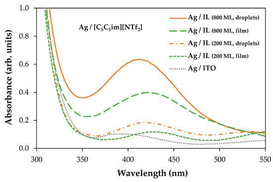 UV-Vis characterization of all IL films with different thicknesses after the deposition of AgNPs was performed with a diode array spectrophotometer using an Agilent 8453 UV-Vis spectroscopy system. The experimental spectra were obtained in the range of 200–800 nm at 298 K. This method was used to confirm the presence of AgNPs in the coalesced IL films, by inferring the characteristic surface plasmon resonance (SPR) peak. The presence of an intense band in the region of 400–420 nm indicated the presence of AgNPs in the IL films/coatings.
