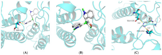 Molecular docking is an important and advantageous tool to verify the interaction sites and affinities between biological macromolecules and small molecule drugs at the molecular level. It is widely used in new drug creation and target prediction [25,26,27]. In order to evaluate the hypothetical binding mode between compounds 8b, 9a and 14b with TMV CP (PDB code: 1EI7), we carried out molecular docking via AutoDock Vina 1.1.2 [28]. As shown in Figure 4: compound 8b and amino acid residue SER-138 formed a 2.1 Å hydrogen bond (Figure 4A); compound 14b formed a 3.2 Å hydrogen bond with amino acid residues GLU-131 and PRO-254, respectively (Figure 4C); while compound 9a with poor activity did not form a hydrogen bond with the target protein (Figure 4B). The results of molecular docking are consistent with SAR, which further confirms the interaction between these compounds and TMV CP.