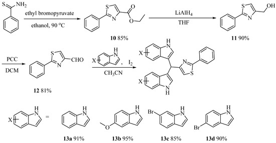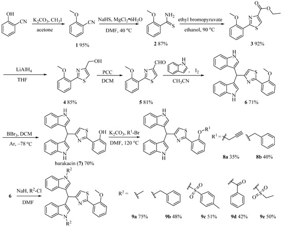 Buzid’s group achieved the synthesis of alkaloid barakacin with an overall yield of 11%, but the yield of the Suzuki coupling step was only 26%, and the raw materials were not easy to obtain, which limited its application in the study of structure-activity relationship (SAR) of these compounds [16]. Therefore, it is necessary to develop a simple and practical route to realize the structural diversity derivation of these compounds. Using the commercially available o-hydroxybenzylnitrile as raw material, compound 1 was obtained by methylation, which reacted with sodium hydrosulfide to produce thioamide 2. Compound 2 reacted with ethyl bromopyruvate to obtain thiazole 3, and then the key intermediate aldehyde 5 was obtained through reduction and oxidation of 3. Aldehyde 5 reacted with indole under the catalysis of I2 to give alkaloid derivative 6. After compound 6 was demethylated, the natural product barakacin (7) was obtained via seven steps in 26% overall yield (Scheme 1). Compared with the methods reported in the literature, the raw materials of our route are easy to obtain, the operation is simple and it is easier to realize the structural diversity derivation of these kinds of compounds. In order to evaluate the effects of hydroxyl on benzene ring and indole NH on biological activity, we designed and synthesized derivatives 8a, 8b and 9a–9e (Scheme 1). To explore the influence of different substituents on the indole benzene ring on the biological activity, compounds 13a–13d were designed and synthesized in a similar way (Scheme 2). Heterocycles are important pharmacophores with a wide range of biological activities. Based on structural simplification and scaffold hopping strategy, we designed and synthesized bisindole derivatives 14a–14g with different ring structures (Scheme 3). To further investigate the substitution effect of the heterocyclic region, we designed and synthesized derivatives 15 and 16a–16c (Scheme 4).