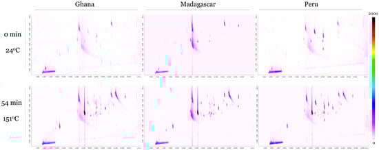 Comprehensive GCxGC-SCD chromatograms for (top) unroasted (0 min, 24 °C) and (bottom) highly roasted (54 min, 151 °C) chocolate samples for the three cacao origins (Ghana, Madagascar, Peru). All chromatograms are scaled the same to allow for direct comparison (0 to 2000 a.u.).